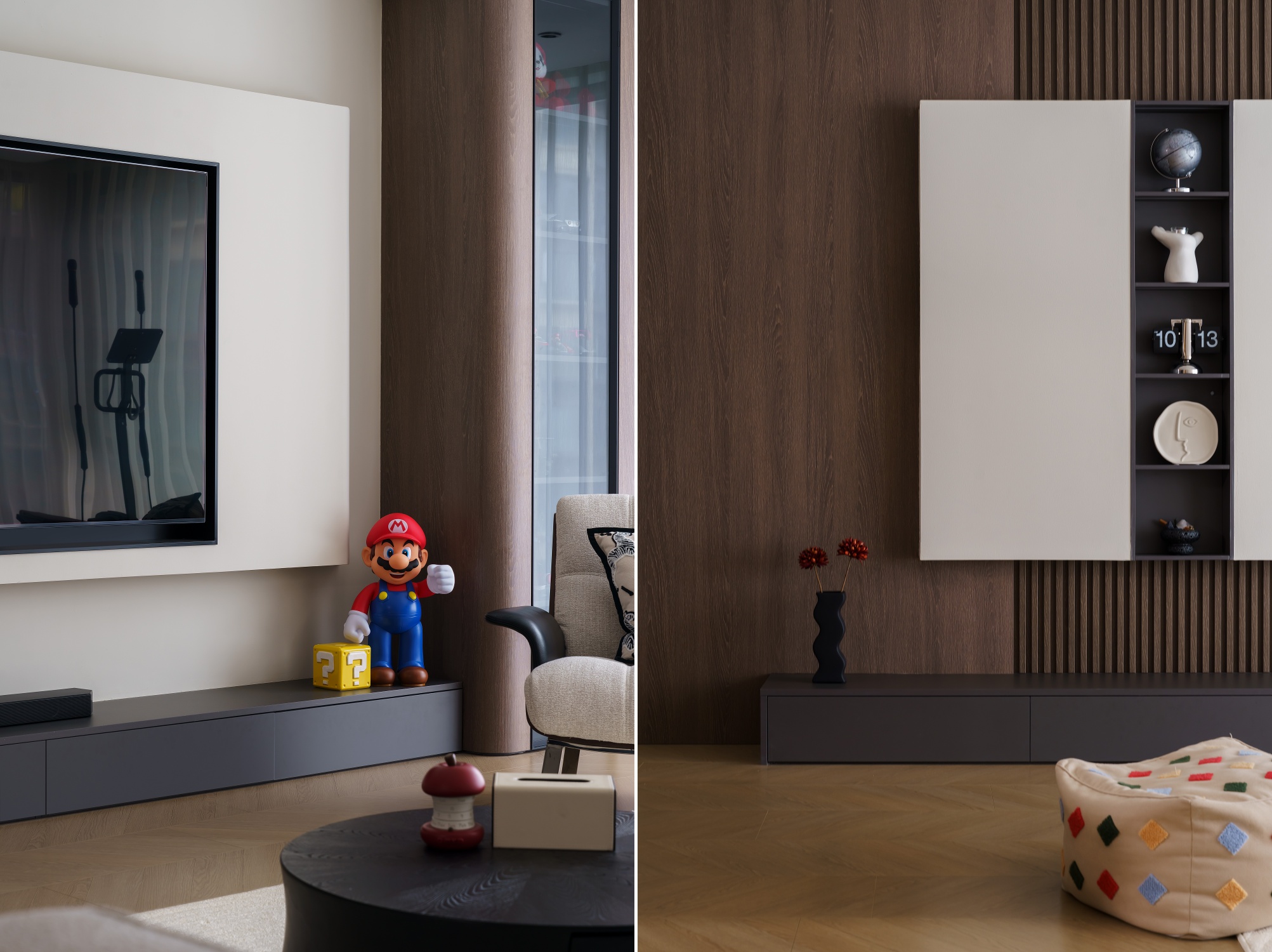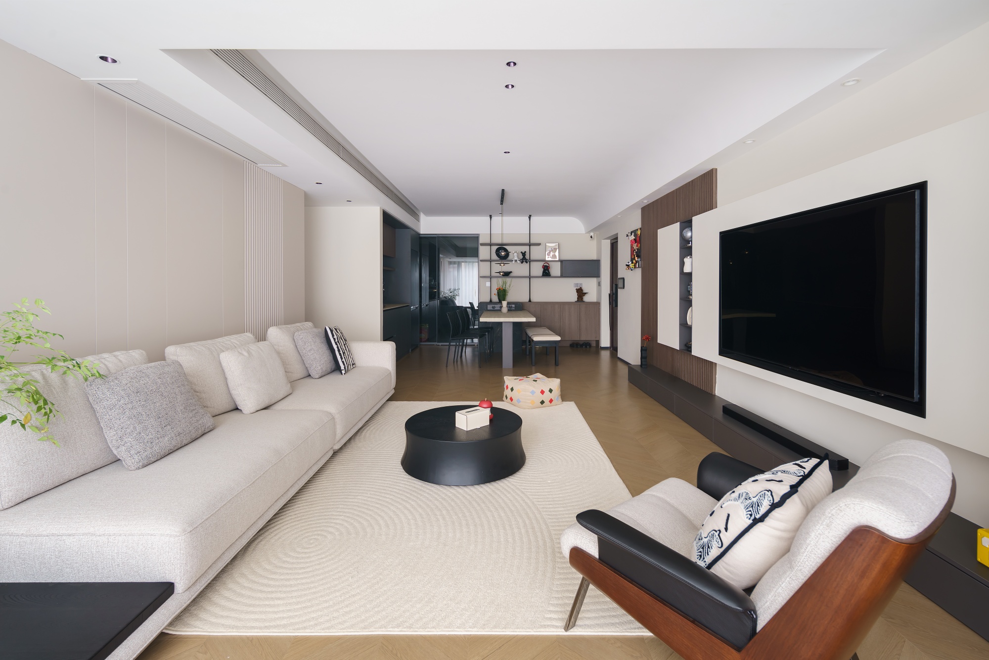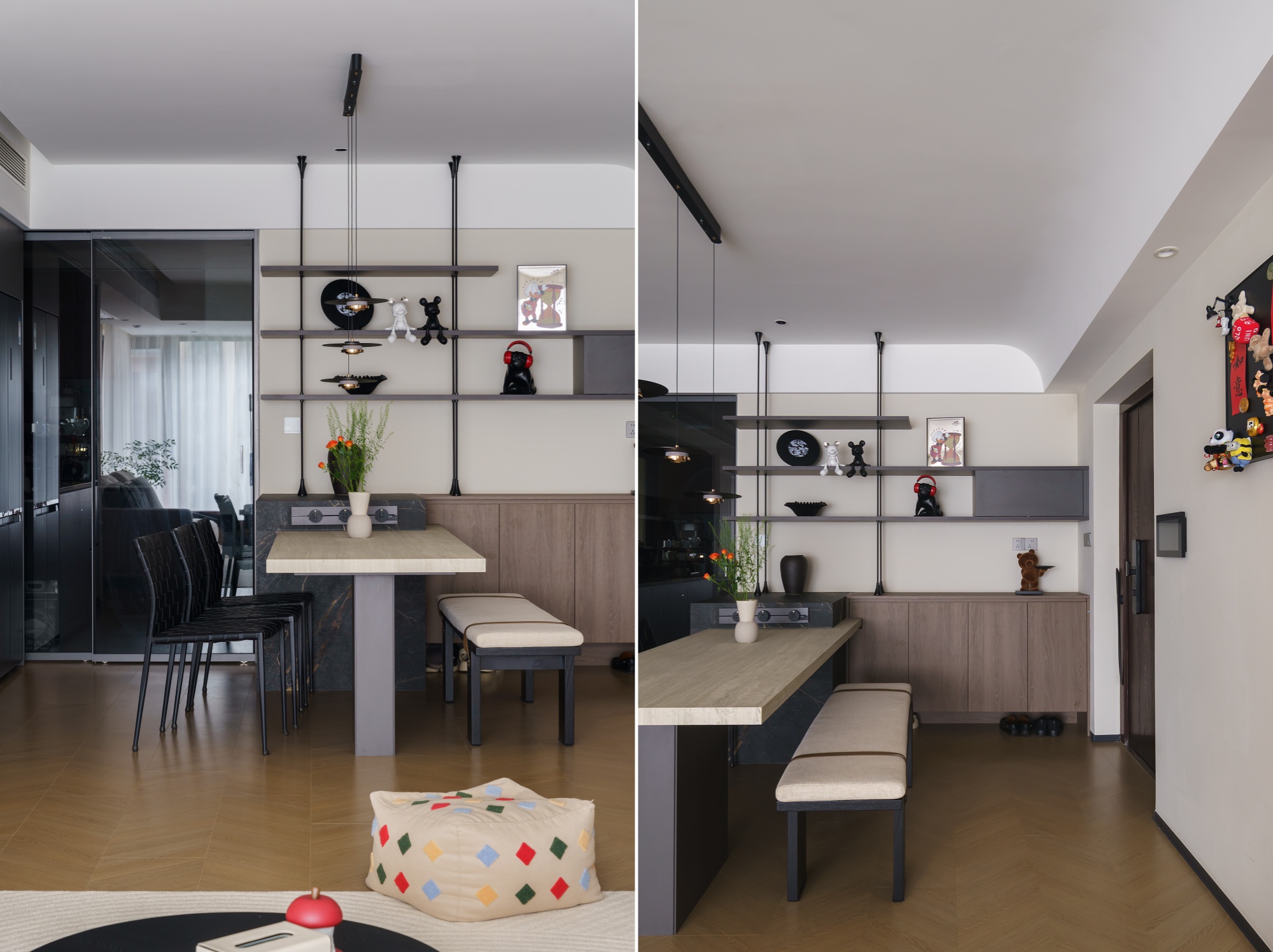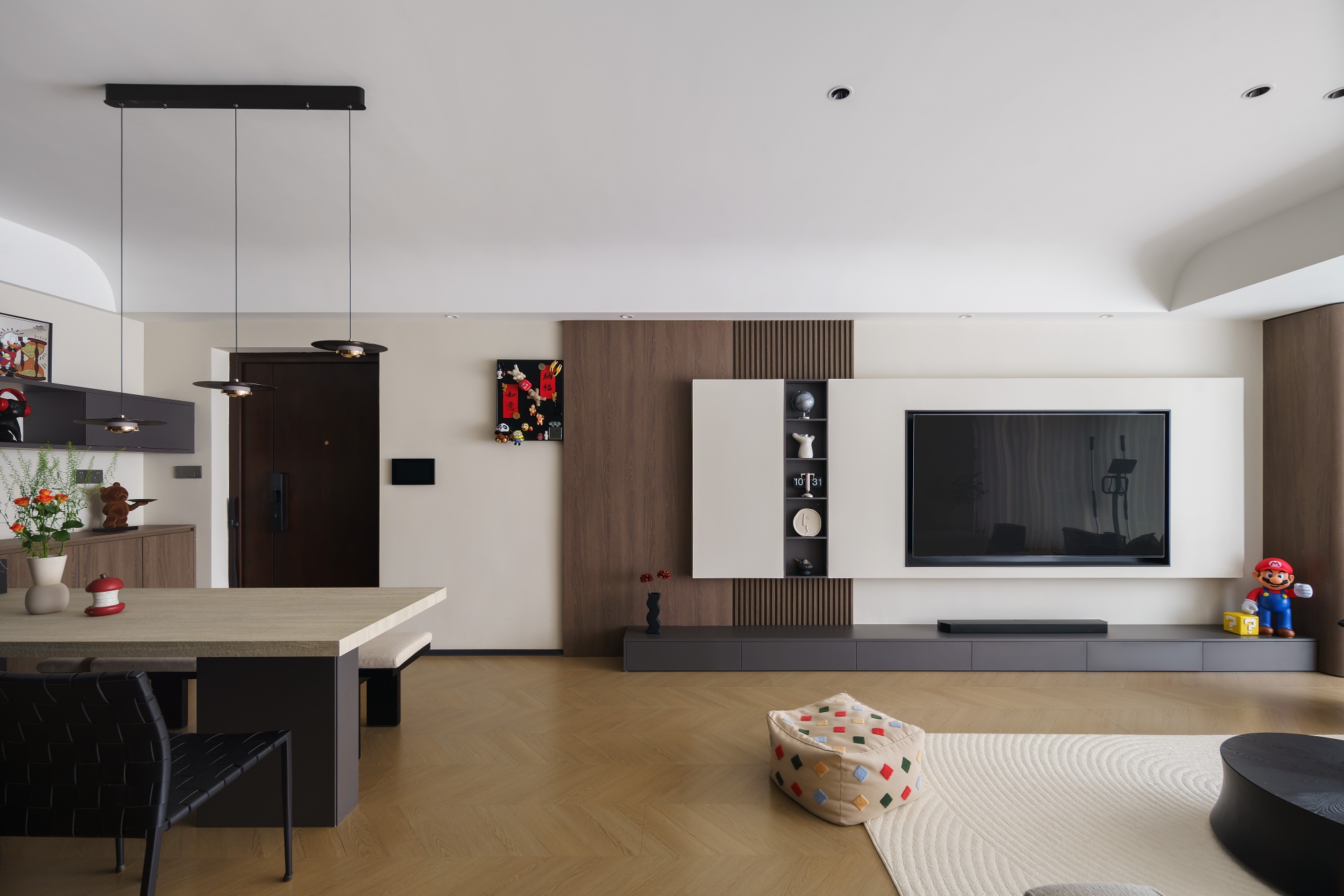 设计师重新构思空间动线,从业主的日常习惯出发,将公区各个空间,以材质与色彩巧妙串联、自然划分。动线流畅,行坐开阔而自由,容纳得起多样的生活场景。休憩区域则专注于舒适度的提升,最终打造出这个盛满习惯、温度与爱的居所。