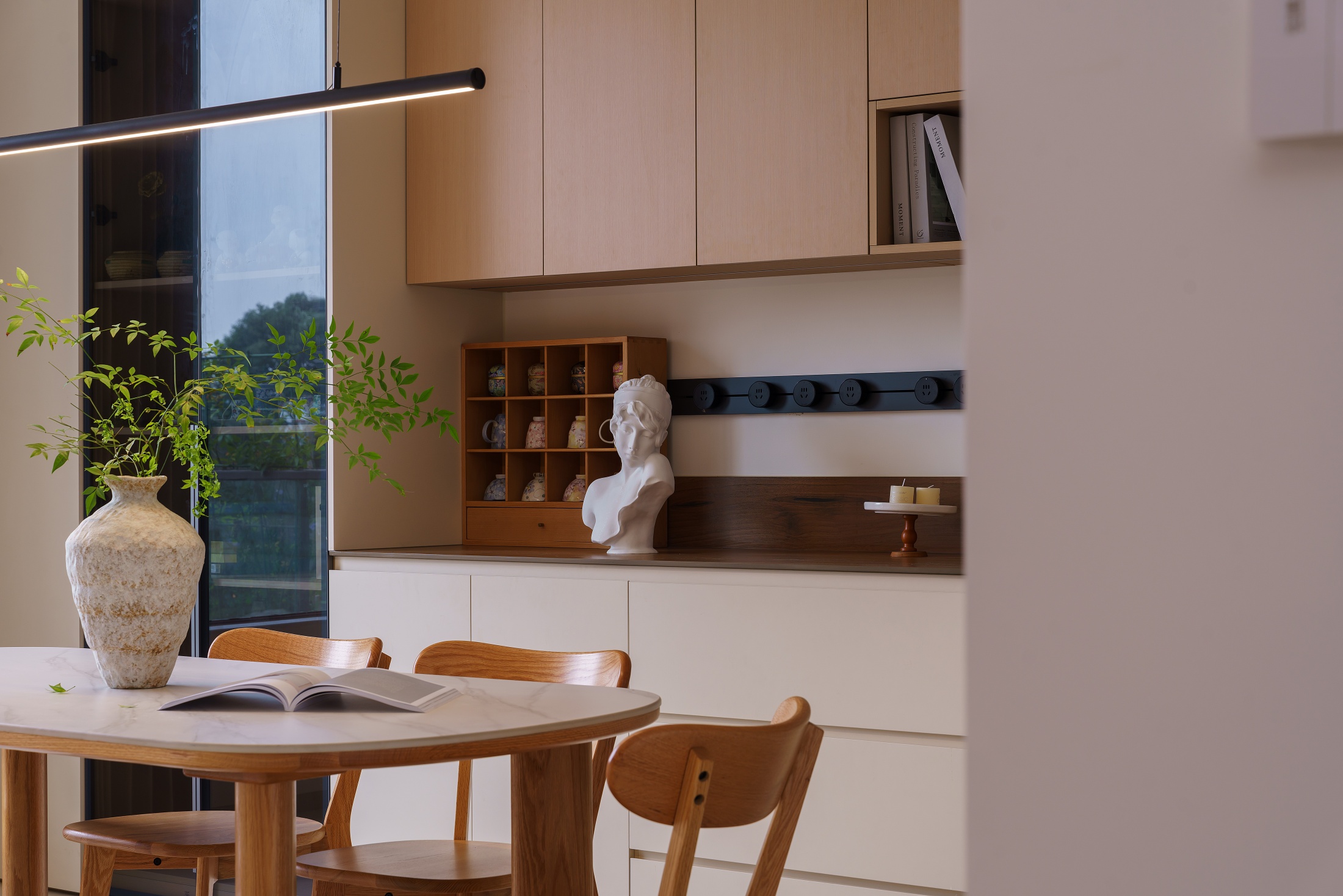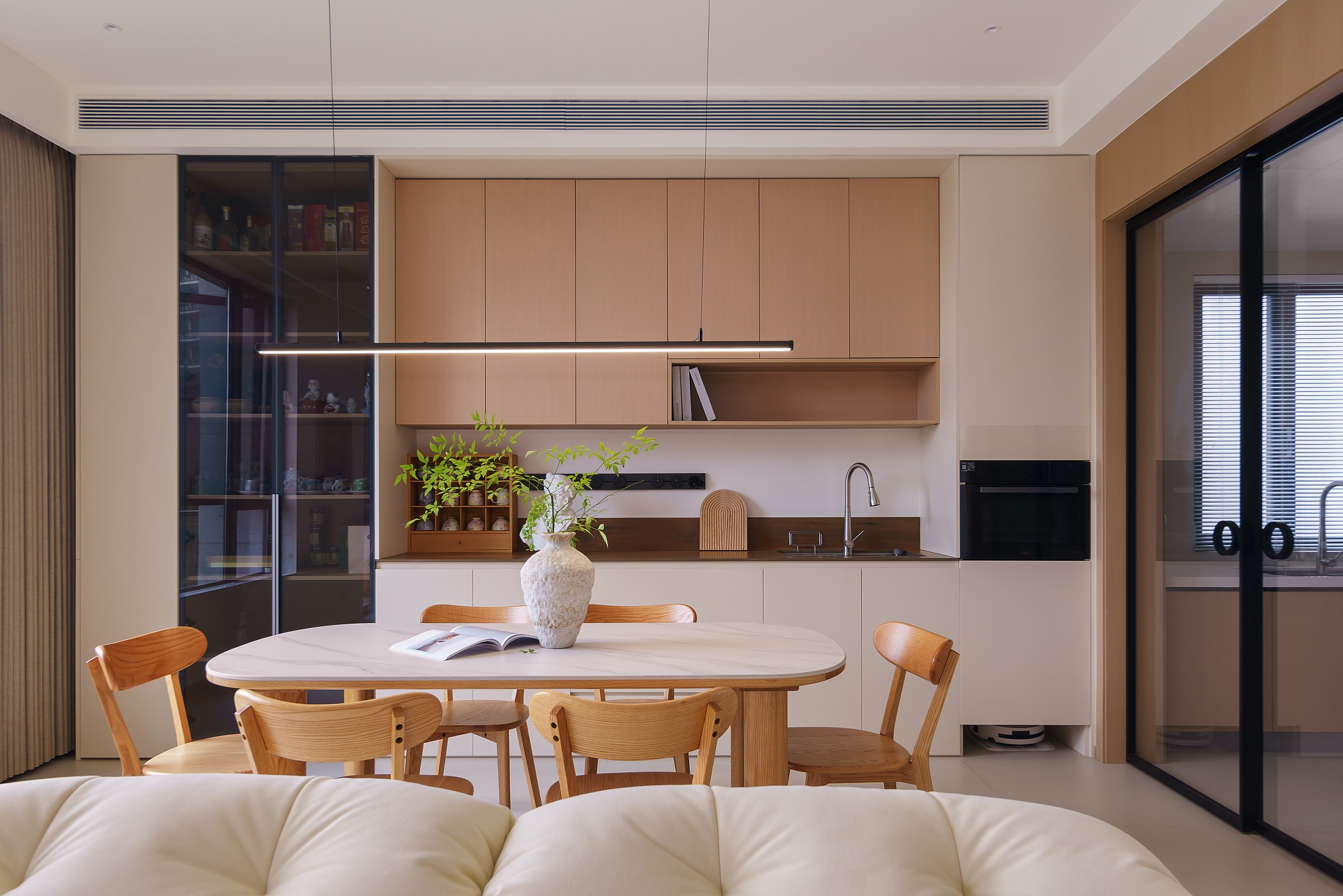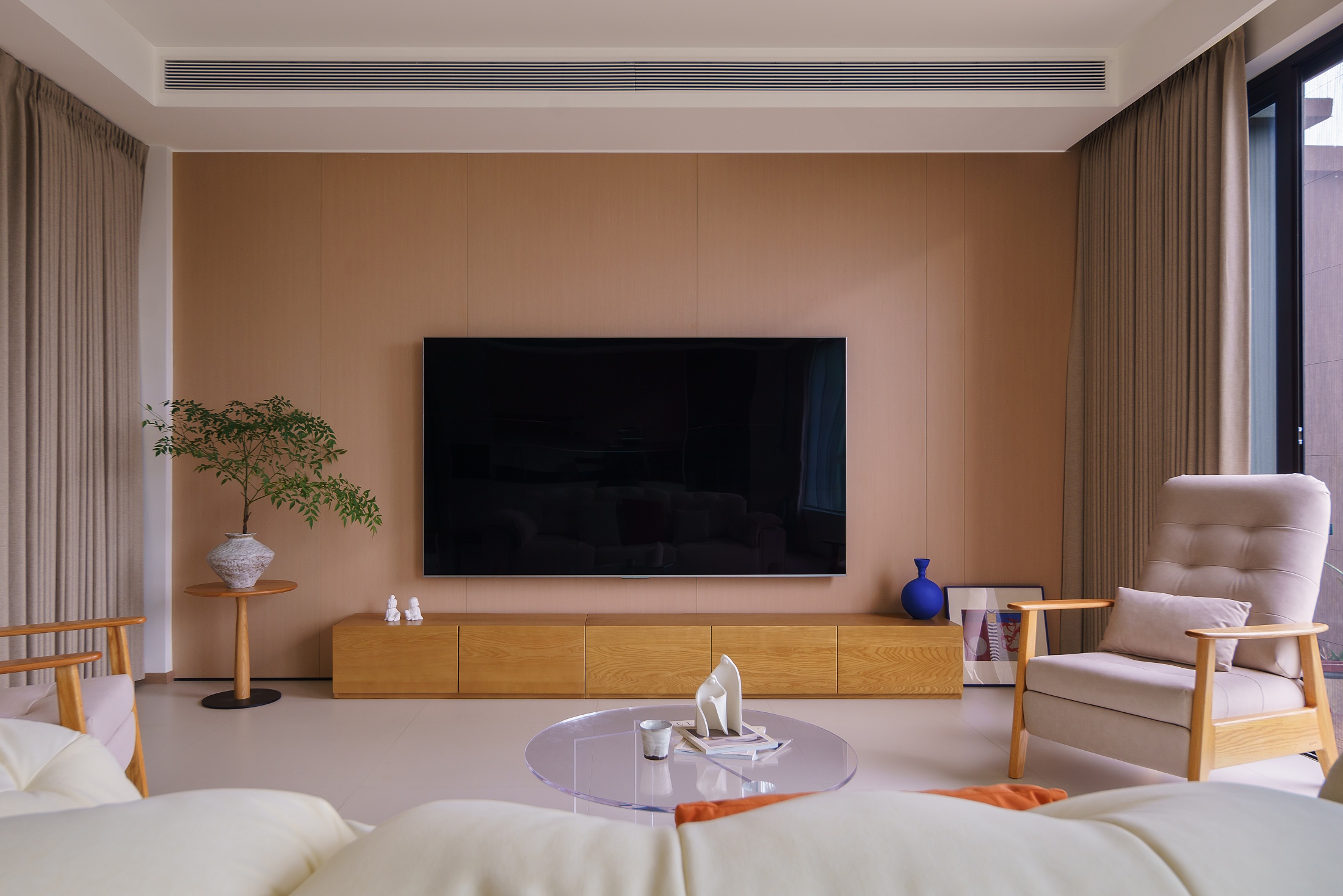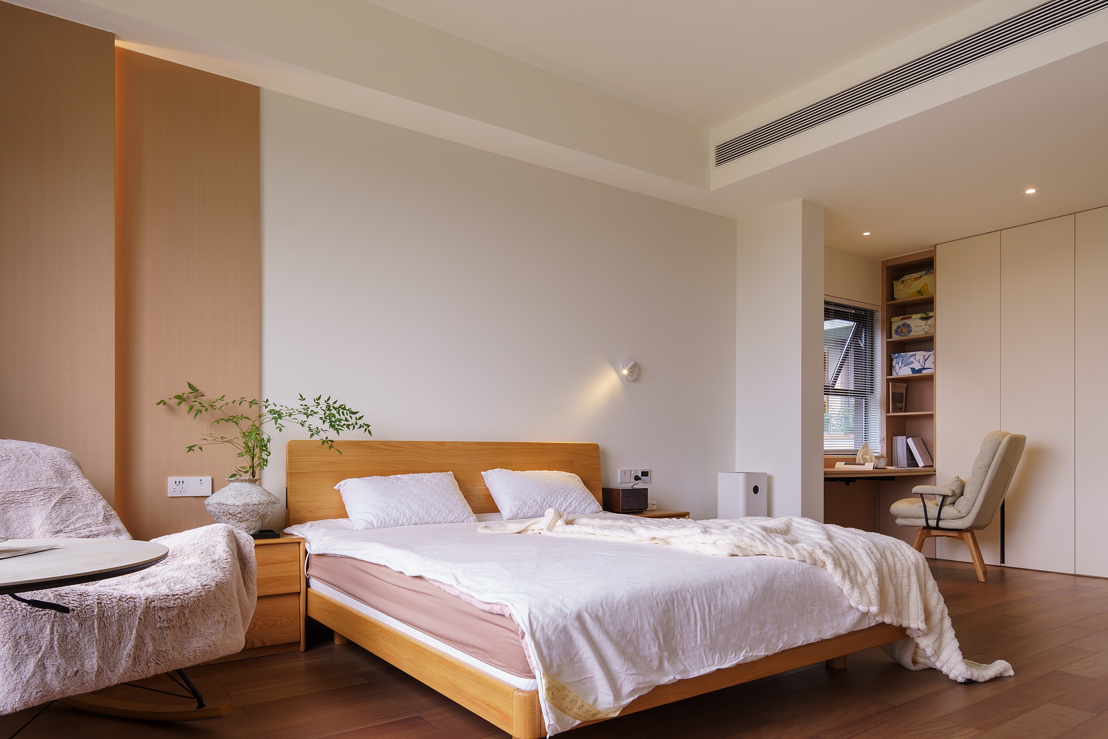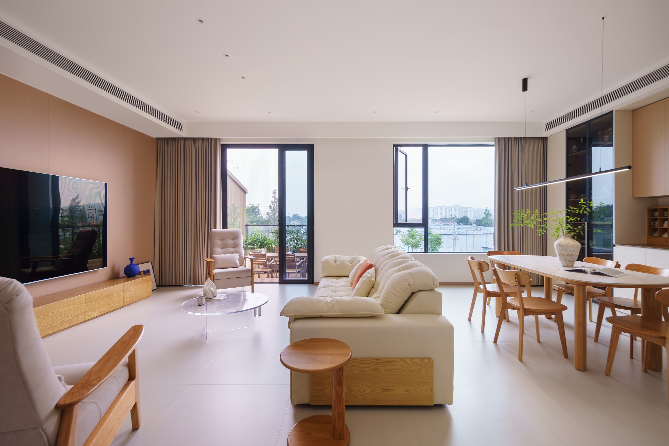 本案以“自然共生”为核心,在原有建筑框架基础上,优化空间格局,实现室内外联动。融合现代风格的简练线条与原木、白色的自然肌理,打造出一个既贴合功能需求、又充满呼吸感与舒适度的理想之家。
