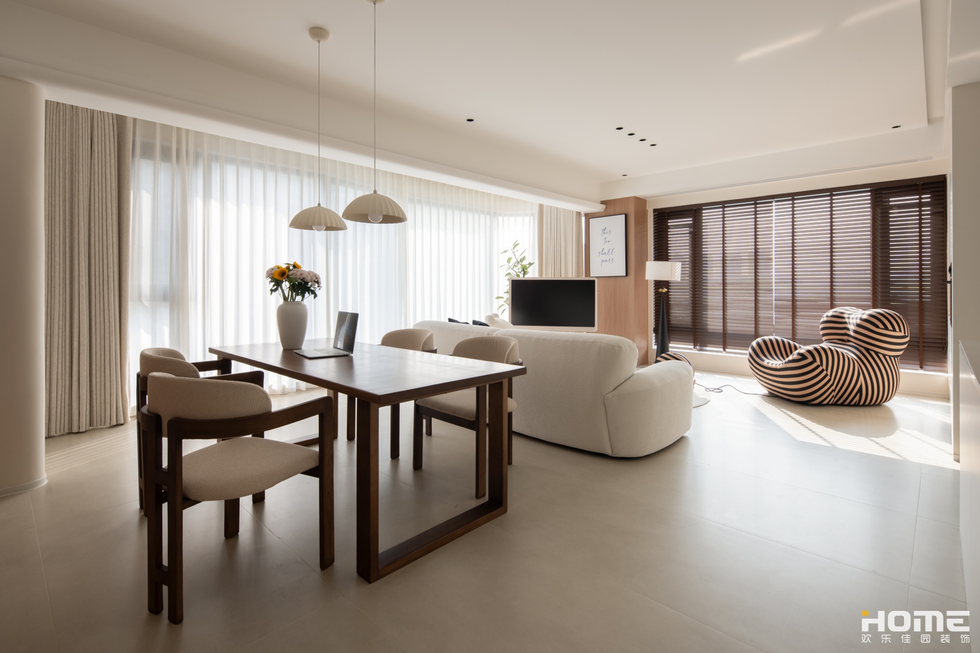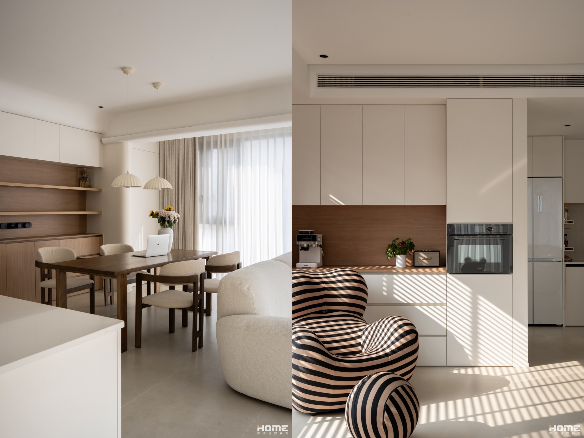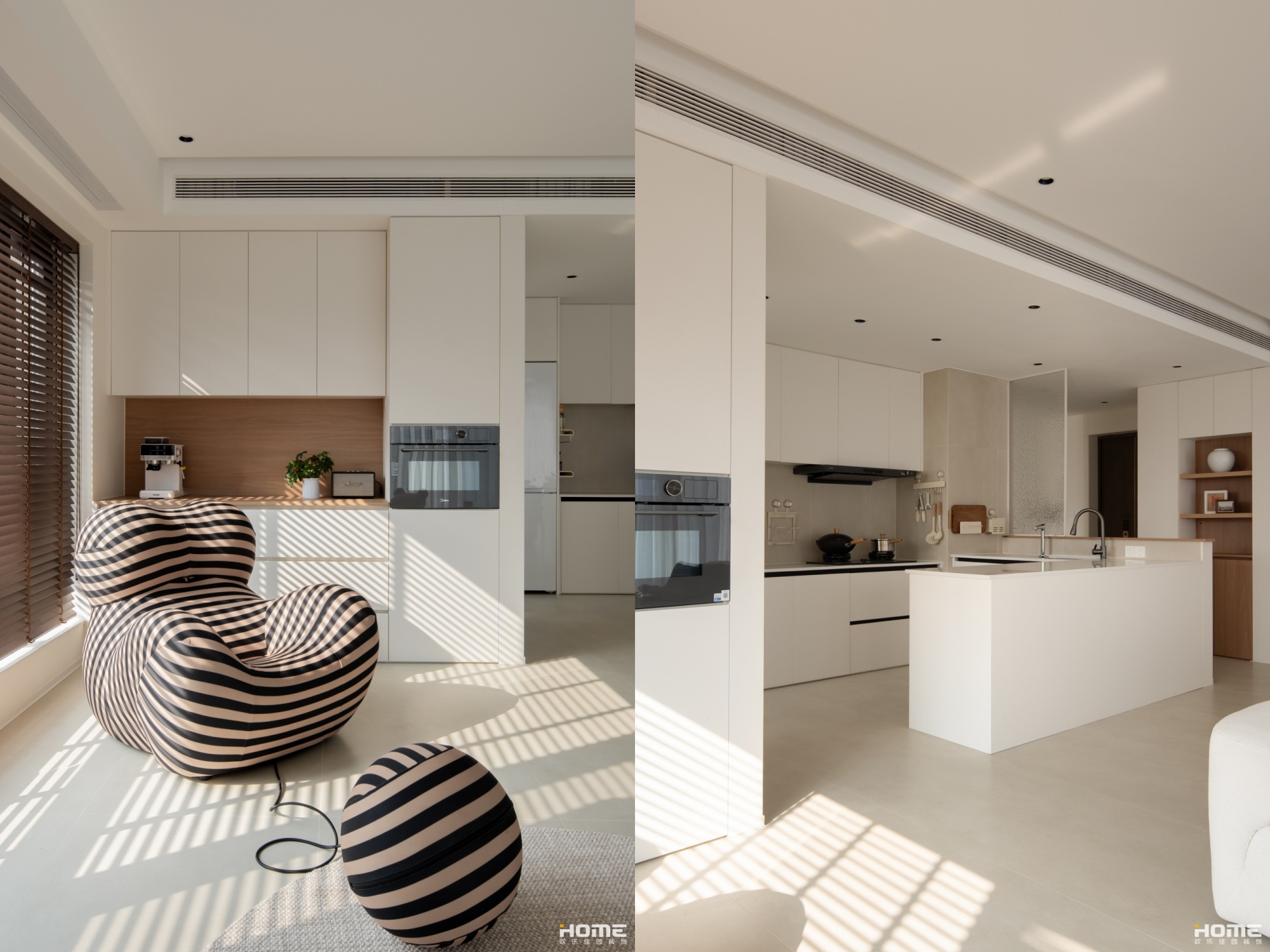 本案围绕“开放与联结”展开设计,开放式客餐厨设计,以流畅的动线打破隔阂,在扩大空间视野的同时,也赋予起居生活更多元的可能。开放式的布局不仅带来通透的视觉体验,更让家人之间的互动随时发生——烹饪、用餐、休闲、交谈,生活在同一个画面里自然流转。