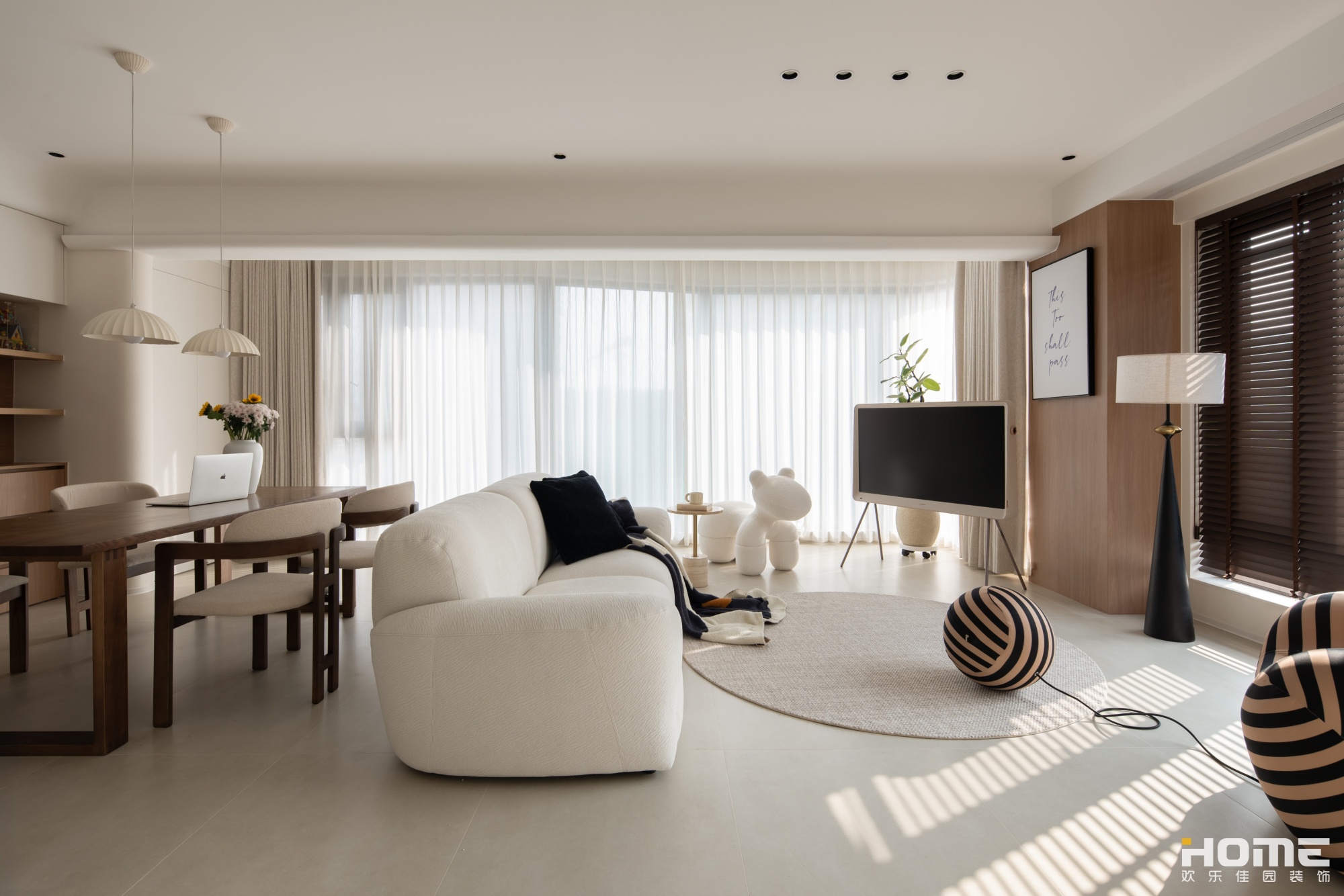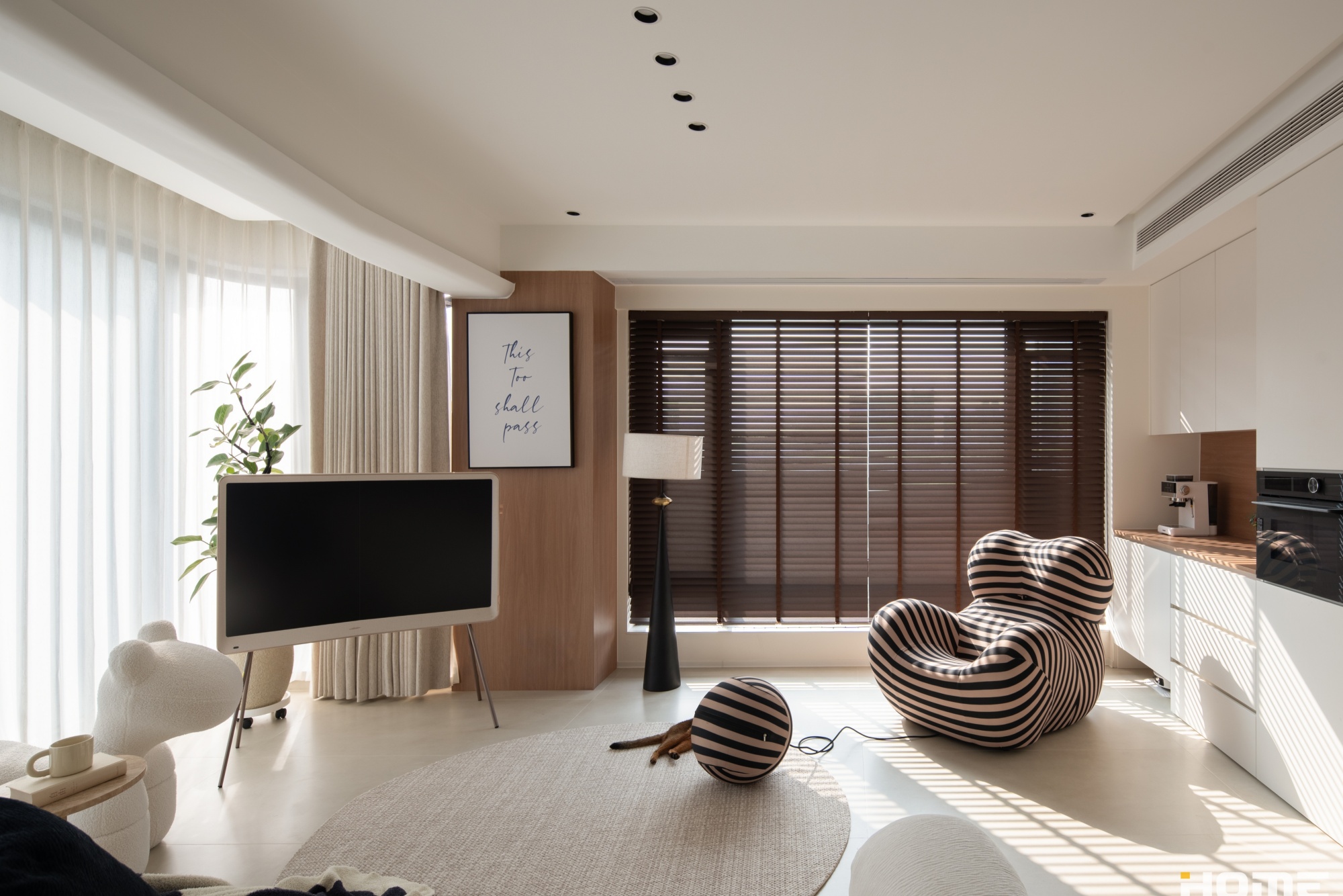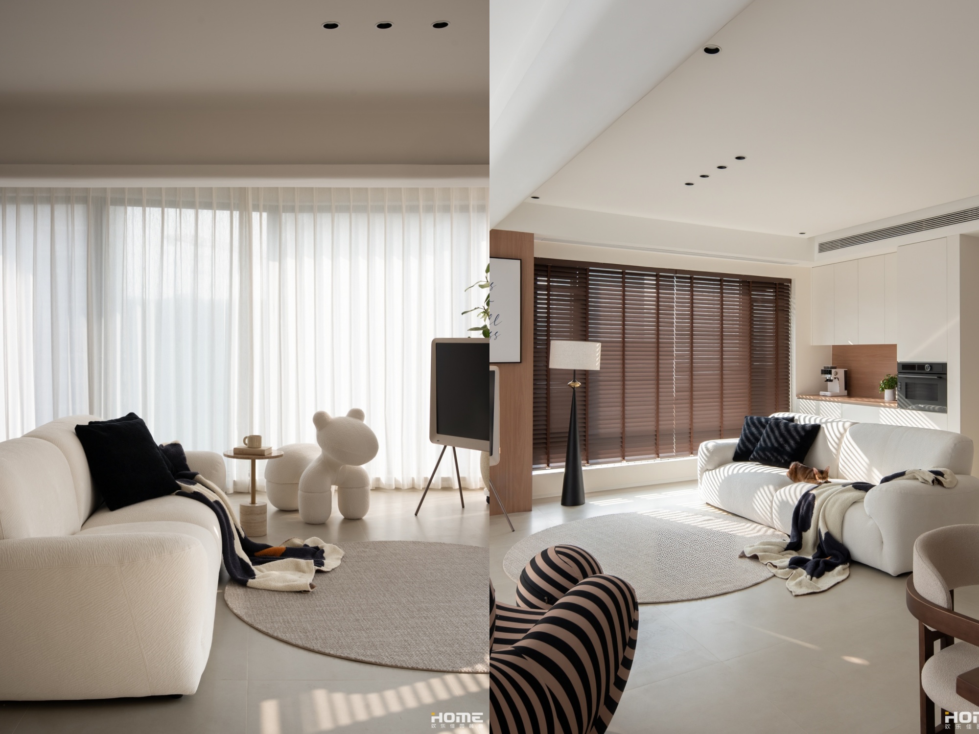 本案围绕“开放与联结”展开设计,开放式客餐厨设计,以流畅的动线打破隔阂,在扩大空间视野的同时,也赋予起居生活更多元的可能。开放式的布局不仅带来通透的视觉体验,更让家人之间的互动随时发生——烹饪、用餐、休闲、交谈,生活在同一个画面里自然流转。